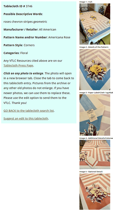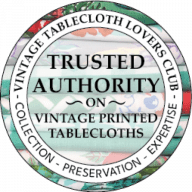 The Vintage Tablecloth Lovers Club (VTLC) was established in the late summer of 2002 by enthusiasts of 1930's - 1970's vintage printed tablecloths. The purpose of the club is to promote the education and appreciation of these pieces of "Kitchen Textile Art" from our past, as well as to have fun sharing our hobby and creating lasting friendships. Please explore all the tabs on this website home page. Becoming a paid member provides access to our searchable database of approximately 3000 vintage tablecloths, providing information about manufacturer, designer, pattern name, etc. This is the only one of its kind in the world. In addition, we have an archive of another 1500 or so tablecloths with the original paper labels, wonderful research articles written by members, monthly on-line tablecloth sales reports, member activities and more as evidenced on the site map. Our forum and live chat options are available to all and offer in-depth conversation beyond the more common social media types. Just choose the “Join Club” tab at the top and follow the prompts.If you have questions or need some help in some way, send a quick email to info@vintagetableclothloversclub.com.The VTLC is a not-for-profit club. The $30.00 a year dues are collected to offset the maintenance of the club and special club activities.