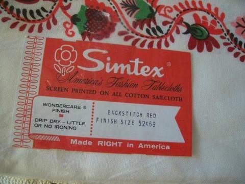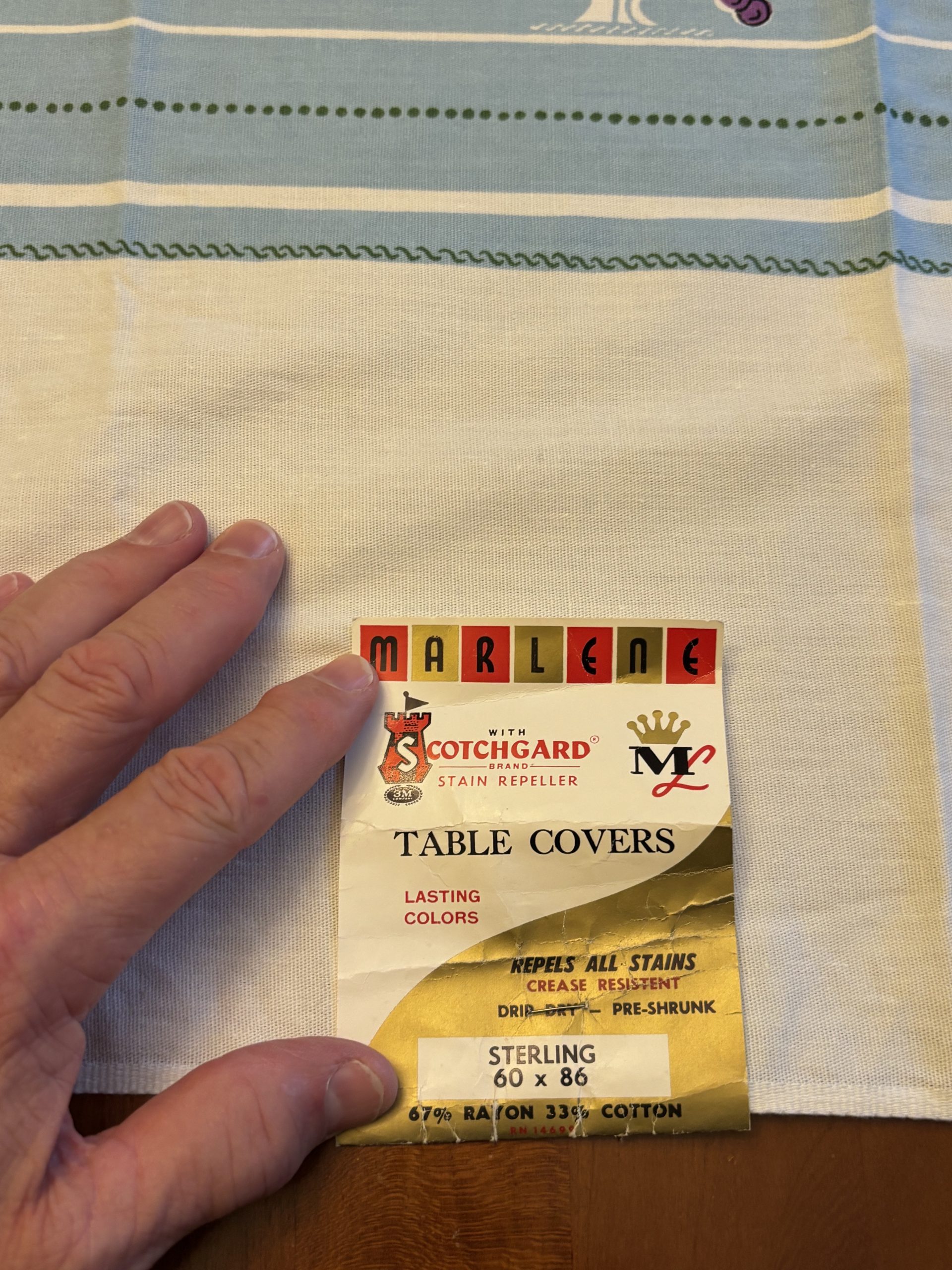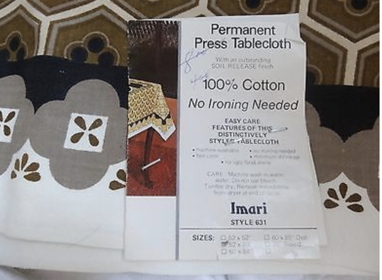 - This category of tablecloth describes a MINT unused cloth with the paper label still attached. Storage stains are acceptable, as are factory defects such as thick threads and inconspicuous dye drips (common for the period). Cloth should be crisp and brightly colored. It may or may not come with a box. This category also describes tablecloths which have had their paper tags removed for professional cleaning and then laminated/bagged and carefully reattached. Storage fading and any other kind of non-storage stains are not acceptable.